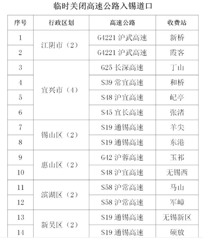 蘇錫常南部高速(S58):臨時關閉運村入常道口,其他正常開放。