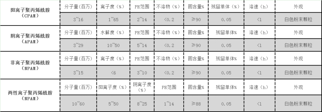 PAM的平均分子量從數(shù)千到數(shù)千萬以上,沿鍵狀分子有若干官能基團(tuán),在水中可大部分電離,屬于高分子電解質(zhì)。根據(jù)它可離解基團(tuán)的特性分為陰離子型聚丙烯酰胺、陽離子型聚丙烯酰胺、和非離子型聚丙烯酰胺。