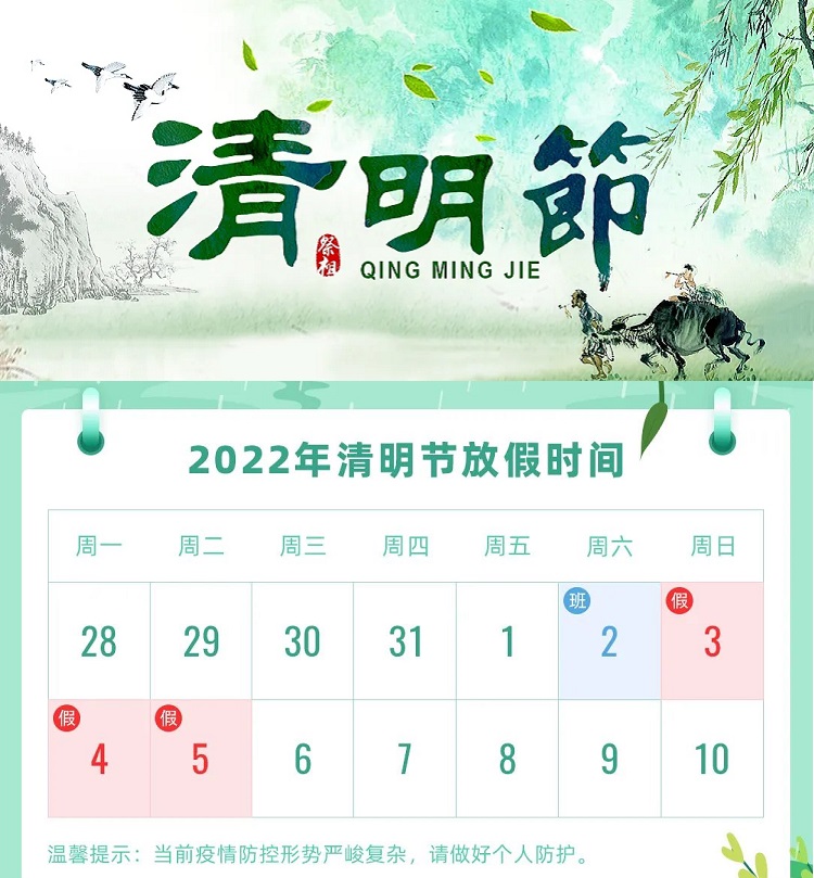 根據(jù)《國務院辦公廳關于2022年部分節(jié)假日安排的通知》,清明節(jié):4月3日至5日放假調休,共3天。