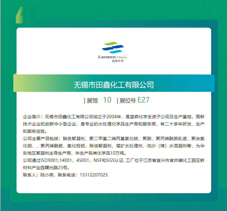 無錫市田鑫化工有限公司將參展第4屆中國環(huán)博會(huì)成都展,展館:10 展位號(hào):E27 展會(huì)時(shí)間:2023.7.12-14 地點(diǎn):中國(成都)西部國際博覽城