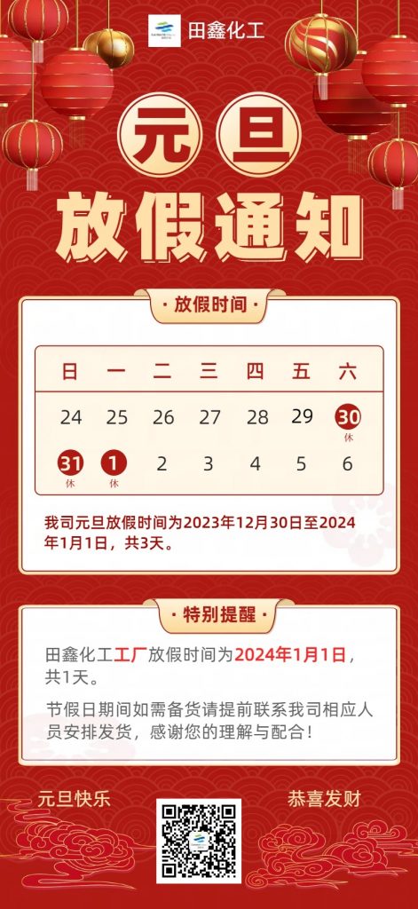 元旦假期將至,田鑫化工放假時間安排如下,望新老客戶知悉: