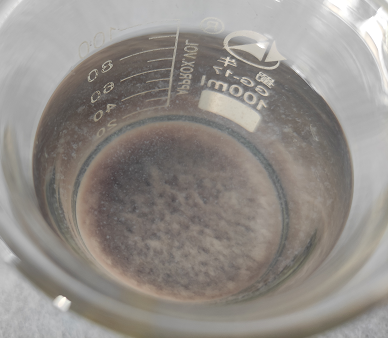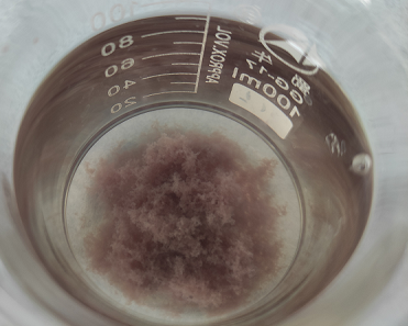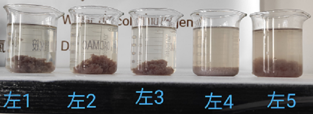 礬花沉降對(duì)比:左一為客戶寄來藥劑沉降效果 (礬花小且沉降不干凈、水渾濁) 右一為我司脫色劑礬花沉降(礬花大且沉降干凈、水質(zhì)清澈)