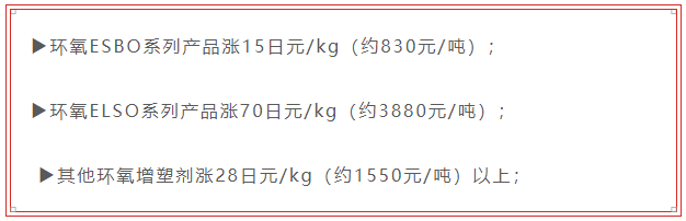 而就在幾天前的1月31日,全球著名的化學(xué)產(chǎn)品生產(chǎn)企業(yè)DIC株式會(huì)社發(fā)布漲價(jià)通知,稱從2月10日的交貨期起,上調(diào)環(huán)氧系增塑劑的價(jià)格。具體漲幅如下: